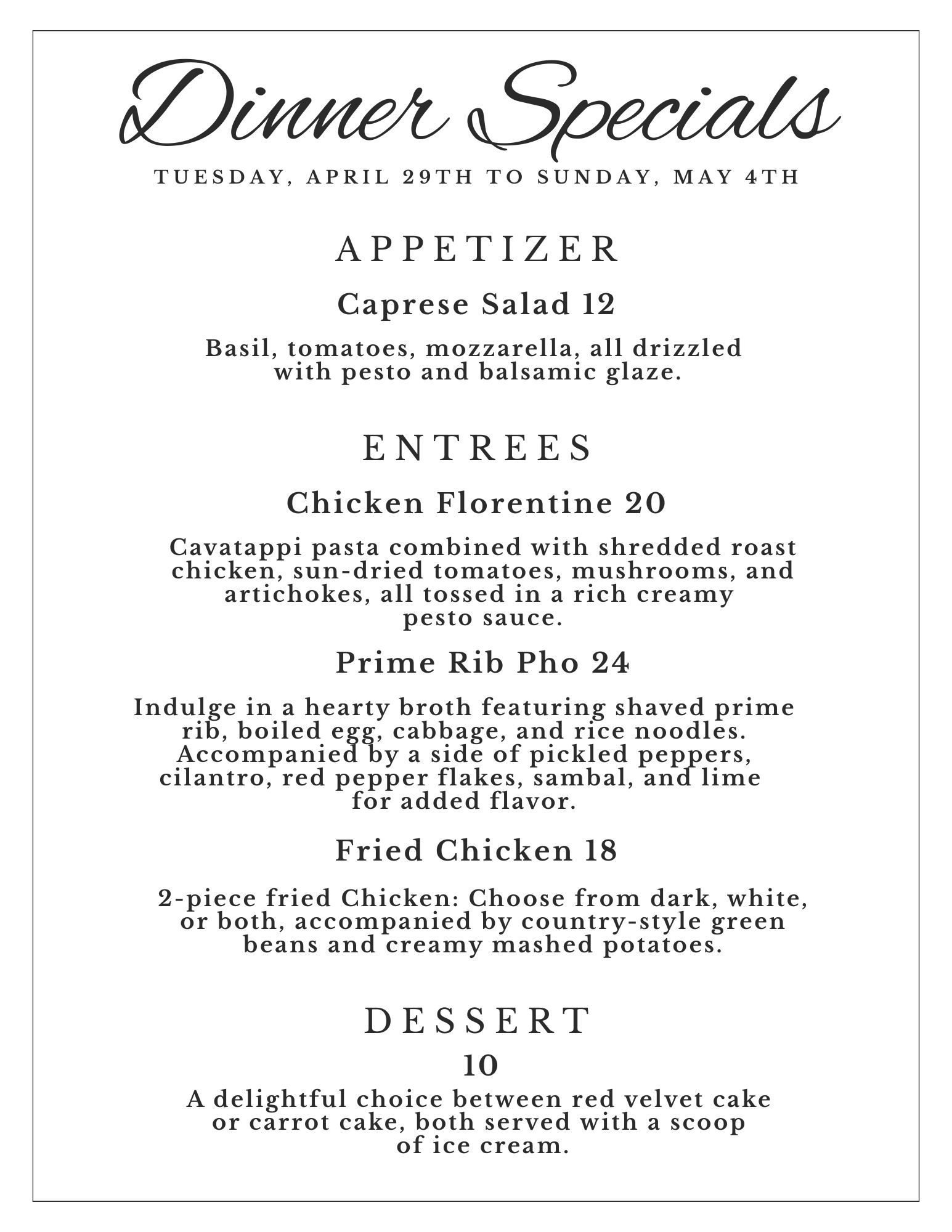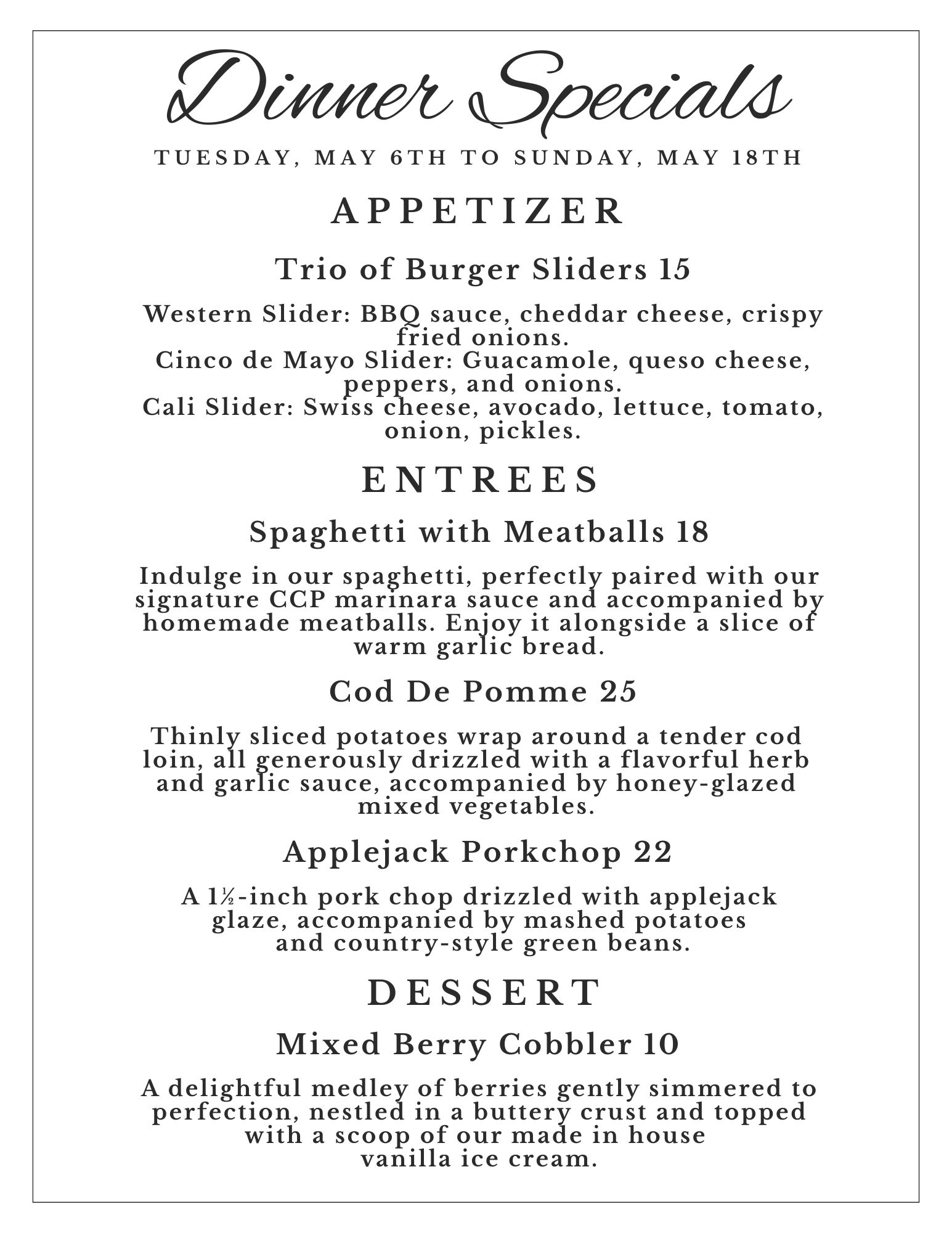 Dinner Specials – December 2-14 Hollie TreasDecember 2, 2025Comments Off on Dinner Specials – December 2-14Dining Room / Social Events (App)