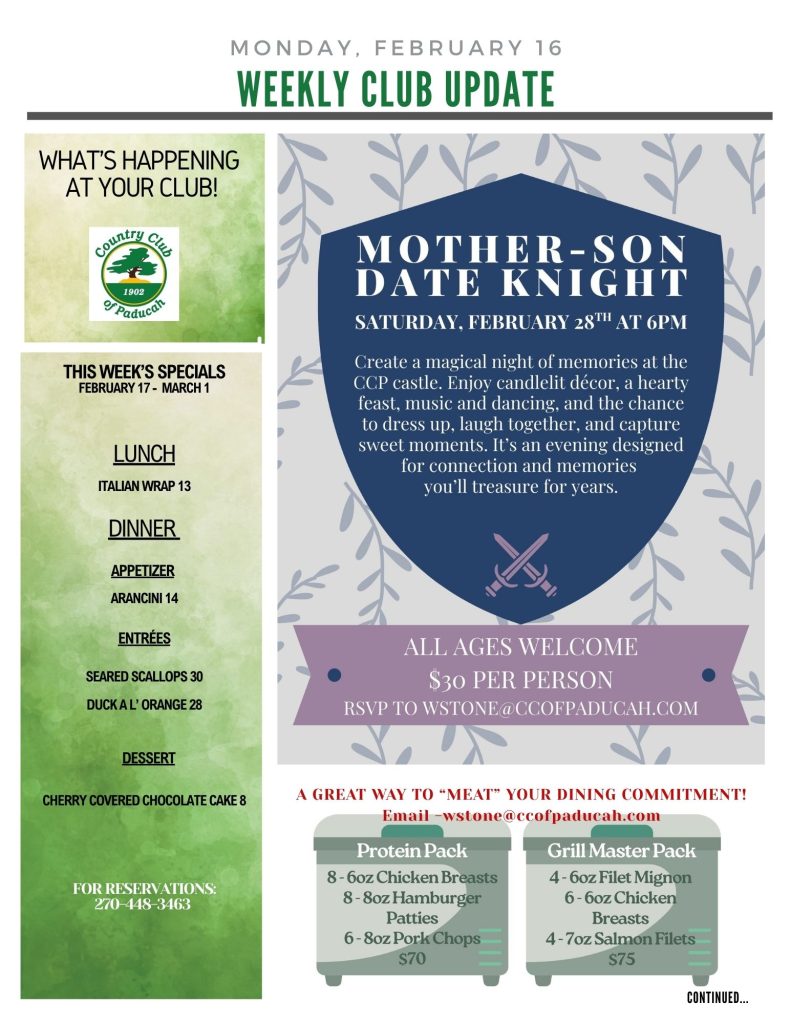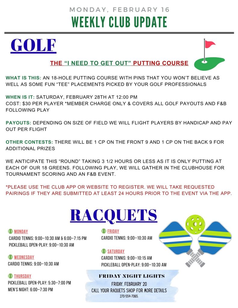 Weekly Club Update – February 16 Hollie TreasFebruary 16, 2026Comments Off on Weekly Club Update – February 16Dining Room / Social Events (App), Golf (App), Tennis (App)