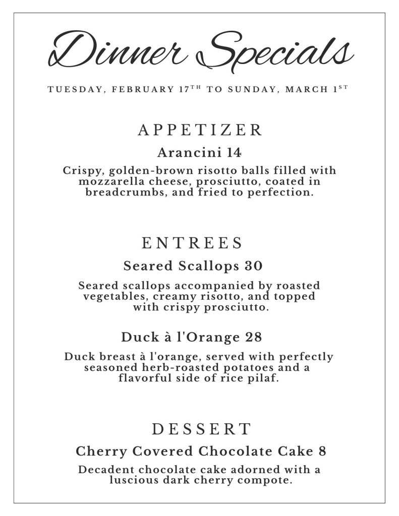 Dinner Specials – February 17-March 1 Hollie TreasFebruary 16, 2026Comments Off on Dinner Specials – February 17-March 1Dining Room / Social Events (App)