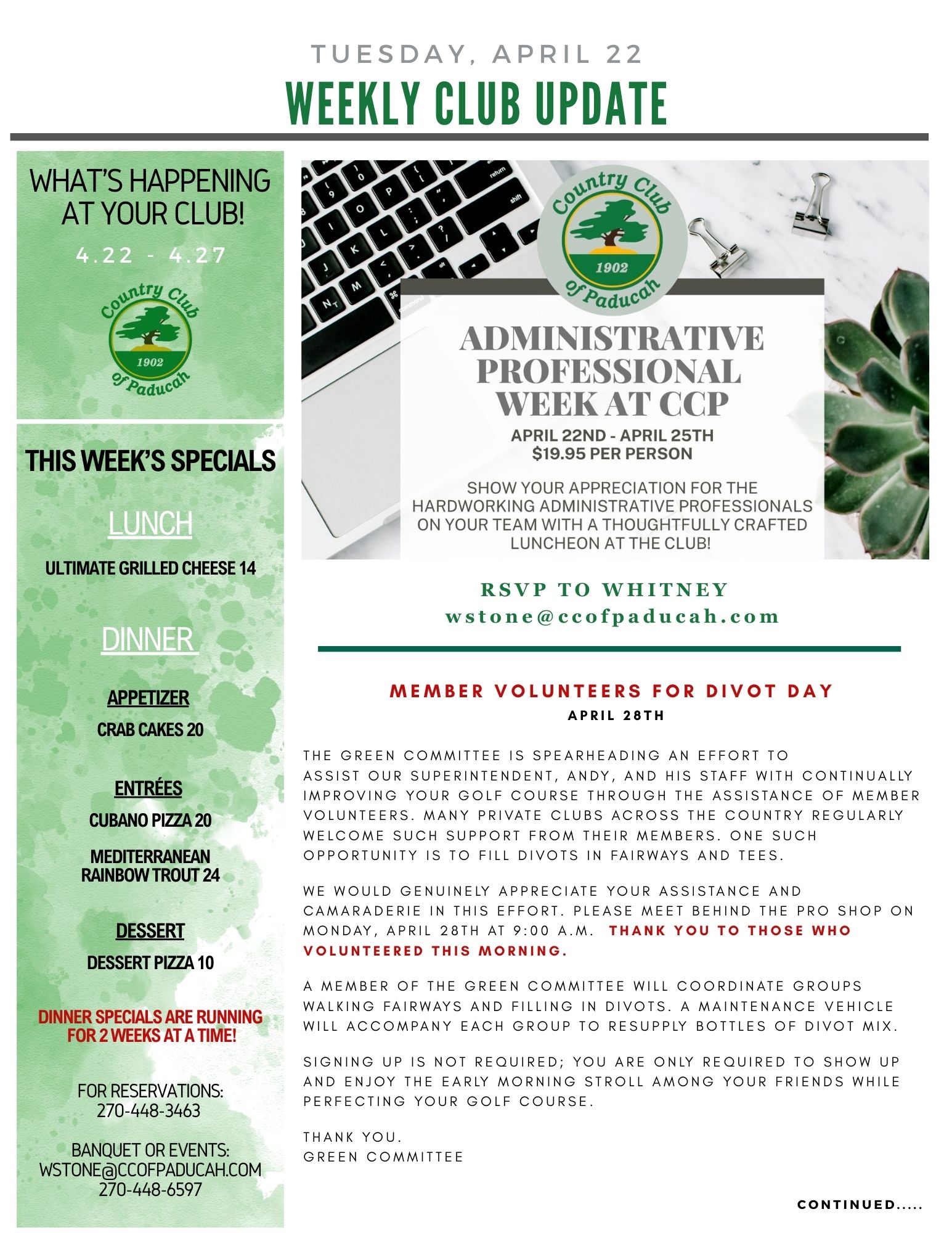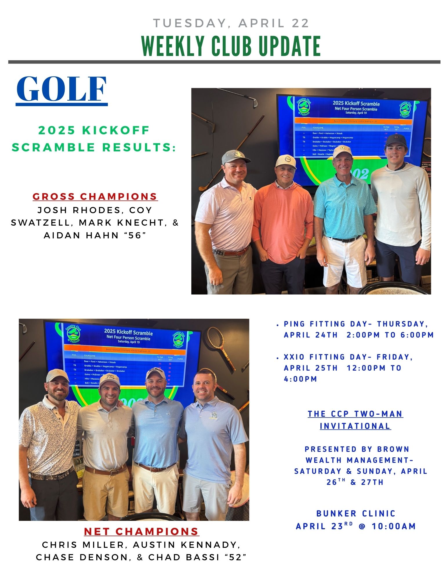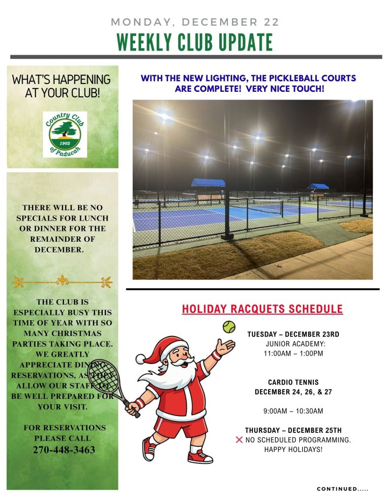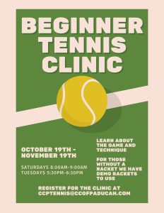 If you haven’t done so already, please create an account on Court Reserve. We kindly ask that all members make court reservations in advance and check Court Reserve for available times outside of scheduled events, lessons, or clinics. You can reserve courts up to one week in advance. If you have any questions, feel free to reach out to us at the Tennis Center or via email at ccptennis@ccofpaducah.com.