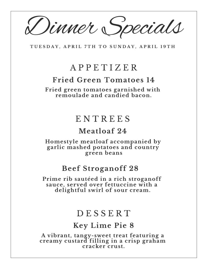 Dinner Specials – April 7-19 Hollie TreasApril 6, 2026Comments Off on Dinner Specials – April 7-19Dining Room / Social Events (App)