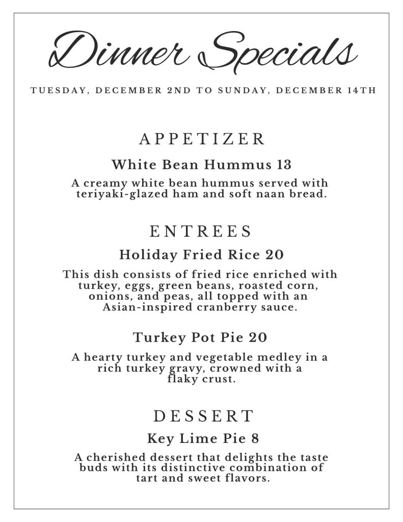 Dinner Specials – December 2-14 Hollie TreasDecember 2, 2025Comments Off on Dinner Specials – December 2-14Dining Room / Social Events (App)