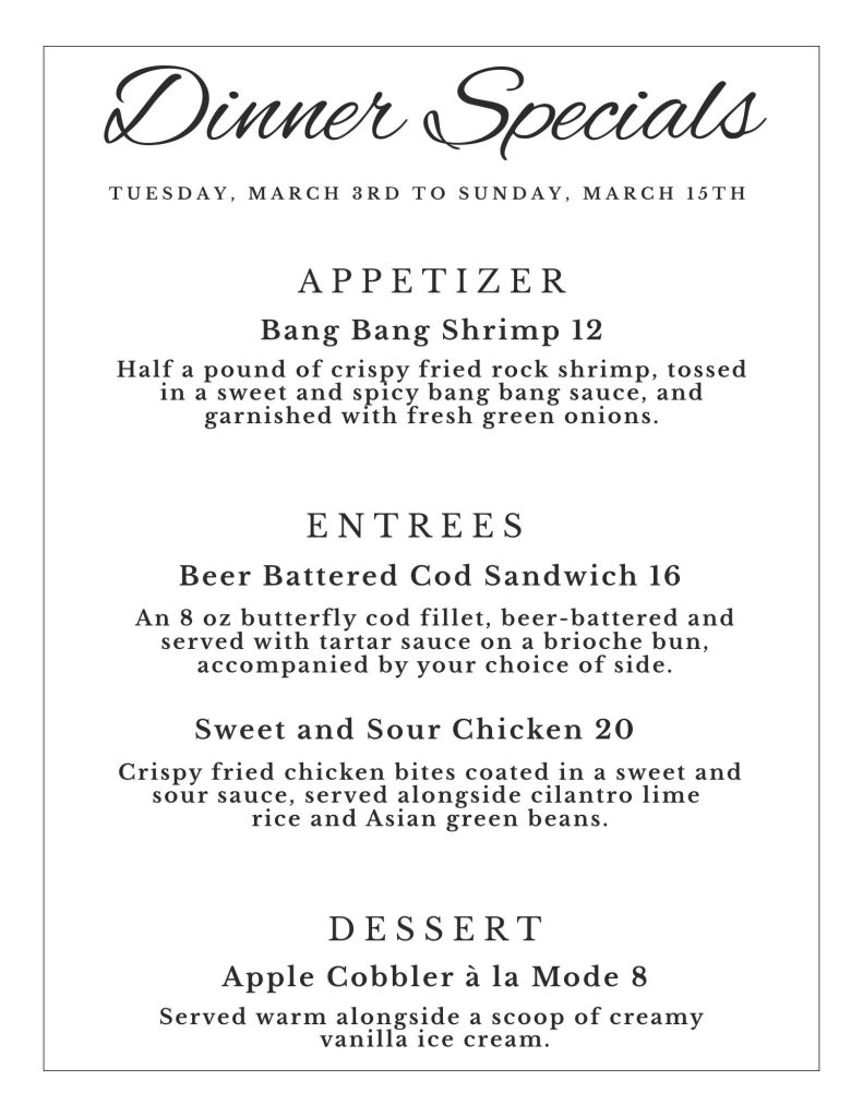 Dinner Specials – March 3-15 Hollie TreasMarch 2, 2026Comments Off on Dinner Specials – March 3-15Dining Room / Social Events (App)
