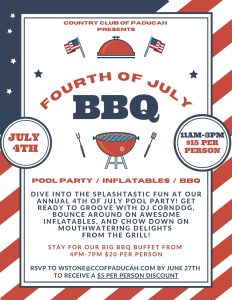 Home Events 4th of July BBQ 4th of July BBQ + Add to Google Calendar + iCal / Outlook export Date Jul 04 2025 Expired! Time 11:00 am - 3:00 pm Category Social Event Share this event Search for: Recent Posts Course Update 12/12 Dinner Specials – December 2-14 Modified Cart Path Only 11/19 Lunch Special – December 2 – 14 CCP Event Update Archives December 2025 November 2025 October 2025 September 2025 May 2025 April 2025 November 2024 October 2024 Categories Course Report (App) Dining Room / Social Events (App) Golf (App) Membership (App) Tennis (App) Uncategorized Meta Log in Entries feed Comments feed WordPress.org
