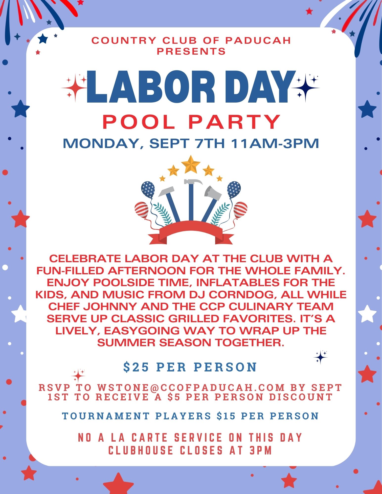 Home Events Labor Day Pool Party Labor Day Pool Party + Add to Google Calendar + iCal / Outlook export 00 days 00 hours 00 minutes 00 seconds Date Sep 07 2026 Time 11:00 am - 3:00 pm Category Social Event Share this event Search for: Recent Posts CCP Event Update Weekly Club Update – March 23 Spring Event Update CCP Event Update Event Update Archives March 2026 February 2026 January 2026 Categories Dining Room / Social Events (App) Golf (App) Tennis (App) Uncategorized Meta Log in Entries feed Comments feed WordPress.org