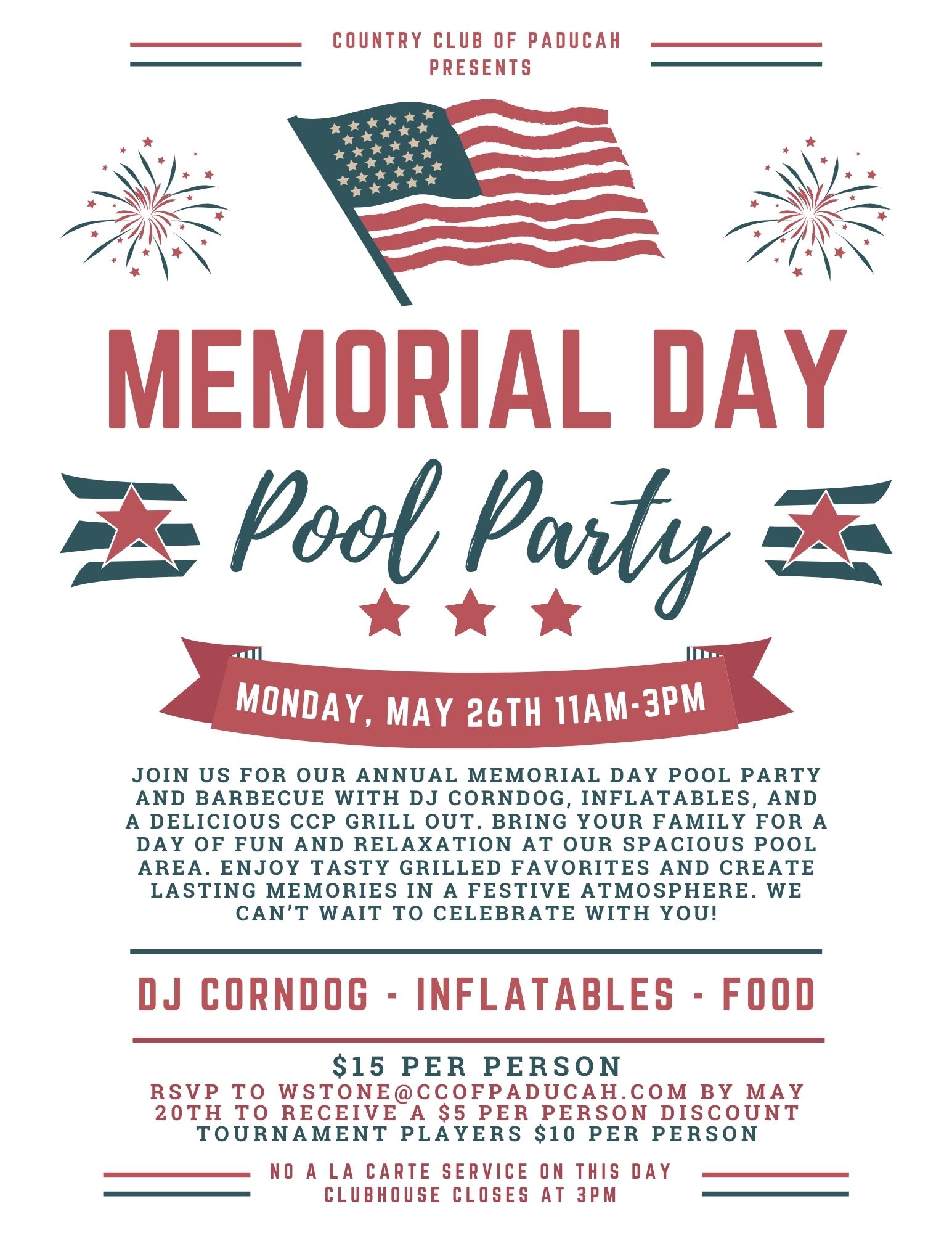 Home Events Memorial Day Pool Party Memorial Day Pool Party + Add to Google Calendar + iCal / Outlook export Date May 26 2025 Expired! Time 11:00 am - 3:00 pm Category Social Event Share this event Search for: Recent Posts Course Update 12/12 Dinner Specials – December 2-14 Modified Cart Path Only 11/19 Lunch Special – December 2 – 14 CCP Event Update Archives December 2025 November 2025 October 2025 September 2025 May 2025 April 2025 November 2024 October 2024 Categories Course Report (App) Dining Room / Social Events (App) Golf (App) Membership (App) Tennis (App) Uncategorized Meta Log in Entries feed Comments feed WordPress.org