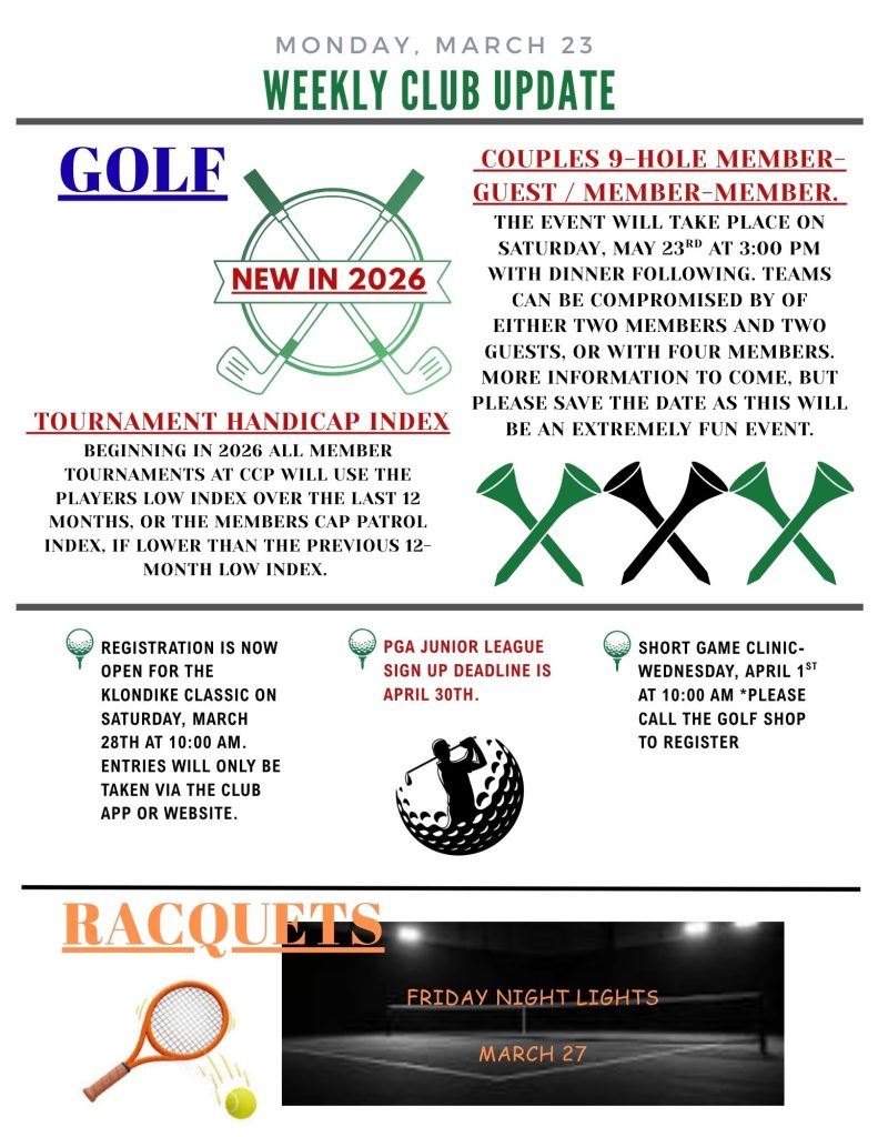 Weekly Club Update – March 23 Hollie TreasMarch 23, 2026Comments Off on Weekly Club Update – March 23Dining Room / Social Events (App), Golf (App), Tennis (App)