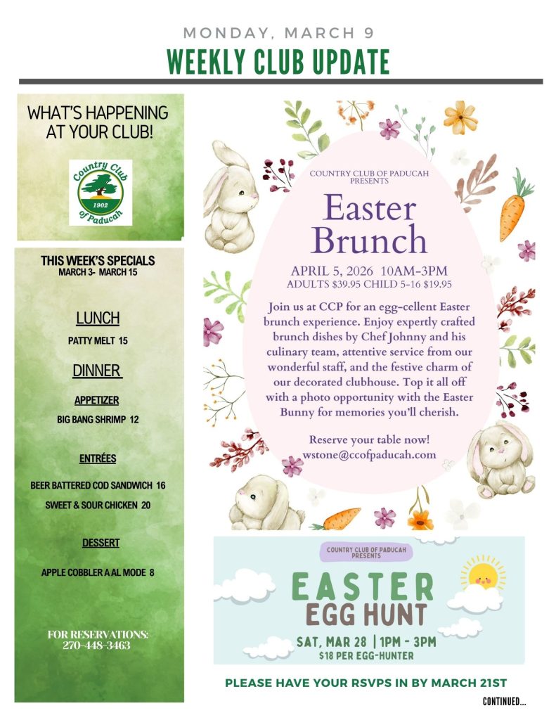 Weekly Club Update – March 9 Hollie TreasMarch 9, 2026Comments Off on Weekly Club Update – March 9Dining Room / Social Events (App), Golf (App), Tennis (App)